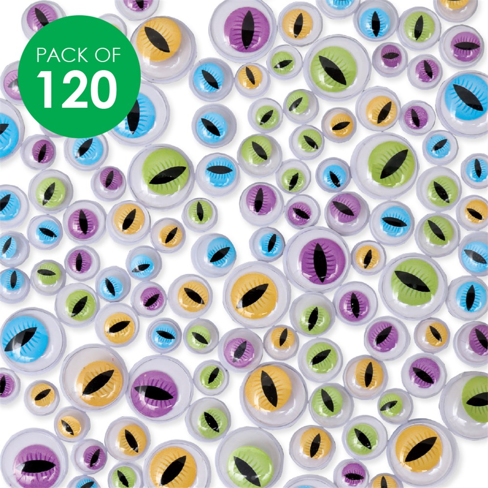 An assortment of 0.7cm, 1cm and 1.5cm self-adhesive wiggle eyes. Assorted colours.