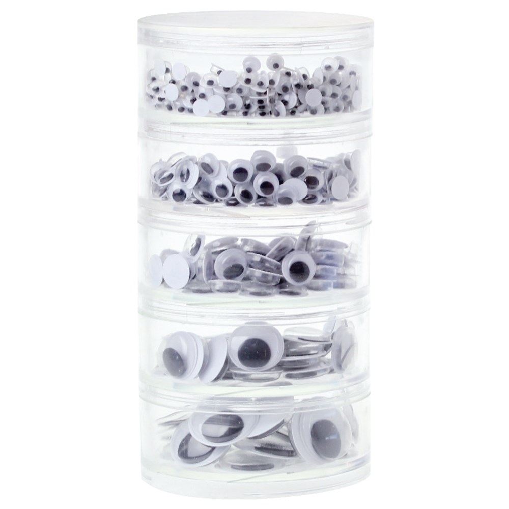 5 stackable tubs of wiggle eyes in 5 assorted sizes (0.5cm, 0.7cm, 1cm, 1.5cm and 2cm).