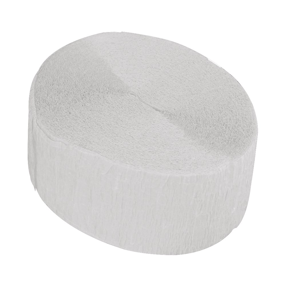 White crepe paper streamer measuring 4.5cm wide and 24m long. 18gsm. Colour may vary.