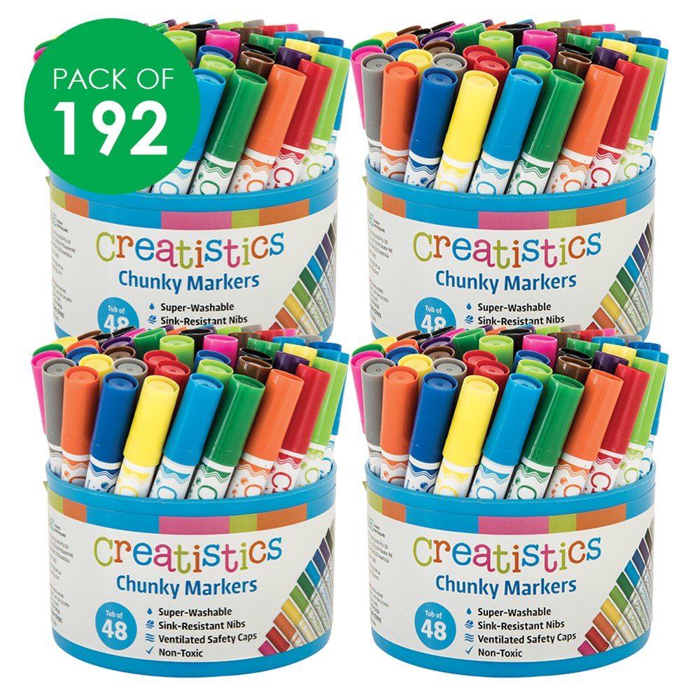 Markers in 12 assorted colours and provided in 4 handy desk tubs. Ventilated safety caps.