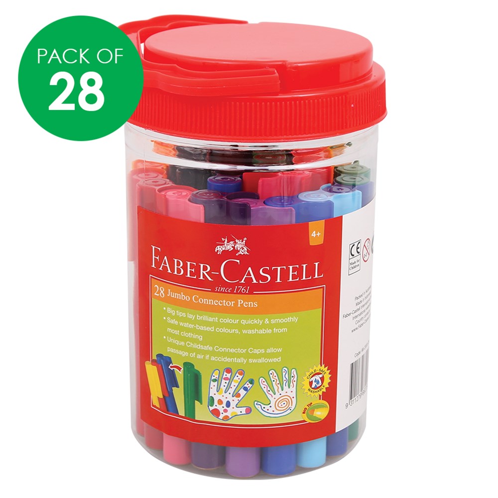 Jumbo Connector Pen Bucket includes 28 pens in 20 assorted colours. Each pen has a large barrel making them easy to grip and use. Storage tub with handle included for easy and convenient storage. Each pen measures 12 x 1.5cm and is created using a non-toxic formula.