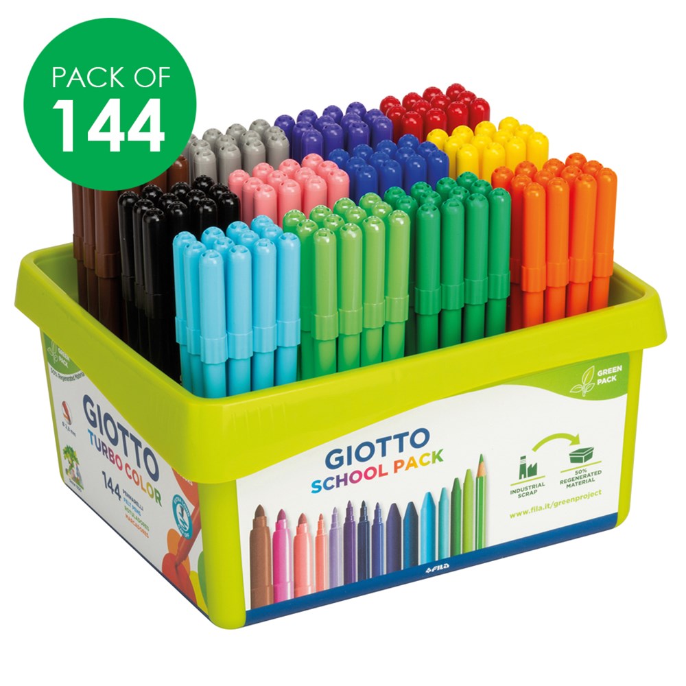 Giotto turbo colour markers classpack contains 144 markers in 12 assorted colours. Storage tub included. Each marker measures 14cm with a 2.8mm tip. Non-toxic.