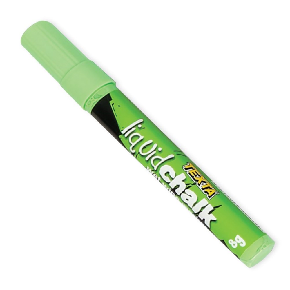 Green liquid chalk marker ideal for decorating and writing on glossy surfaces and blackboards. Simply wet wipe with water to remove. Measures 14cm long.
