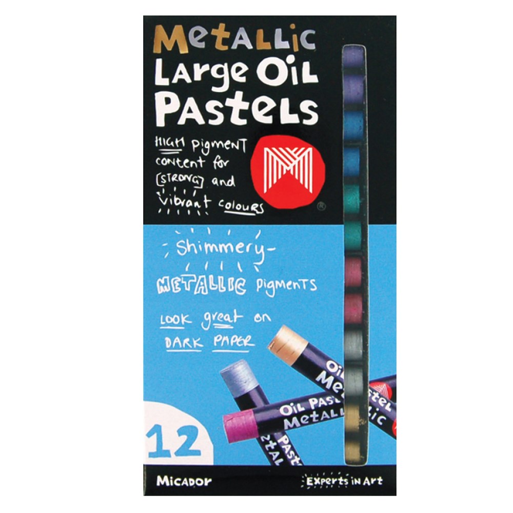 Pack of 12 Micador Large Metallic Oil Pastels in 6 assorted metallic colours. The larger size is great for colouring bigger spaces! Each oil pastel measures 7 x 1.1cm. Non-toxic.