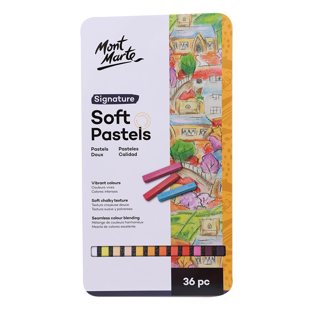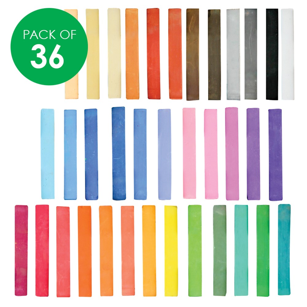 Soft pastels in 36 assorted colours. The pastels feature a soft chalky texture with square ends. Great for blending. Create broad strokes or thin lines using different sides of the pastel. Storage tin included. Each pastel measures approximately 6.7 x 1 x 1cm. Non-toxic.