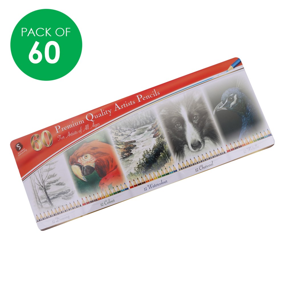 Each pack contains 12 assorted pencils in 5 different pencil types - drawing (lead pencils), colour, watercolour, charcoal and metallic. Each pencil measures 0.7 x 17.5cm. Provided in a handy partitioned tin for storage.