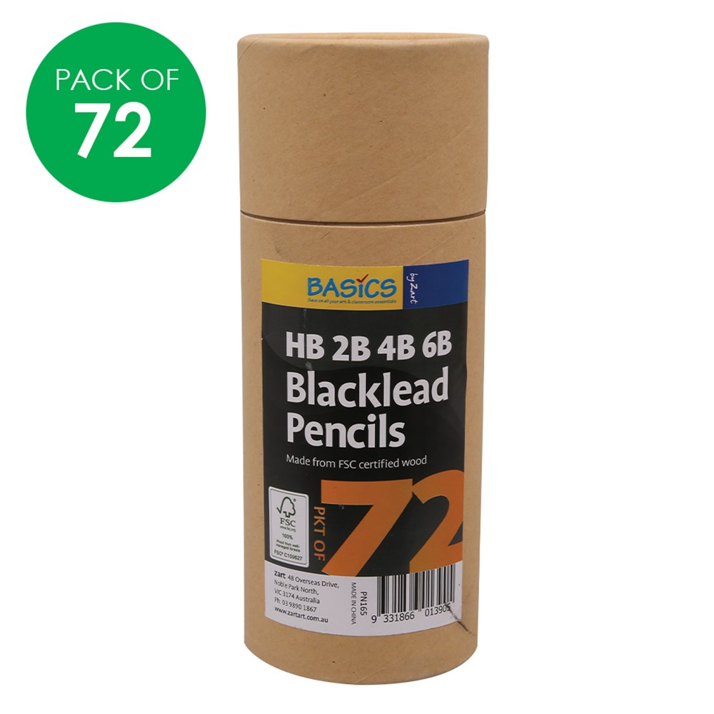 Pack of 72 assorted Pencils. Includes HB, 2B, 4B and 6B lead pencils. 18 pencils of each grade and cardboard storage tube included. Pencils measure 17.5 x 0.7cm each. 100% sustainably sourced wood. Non-toxic.