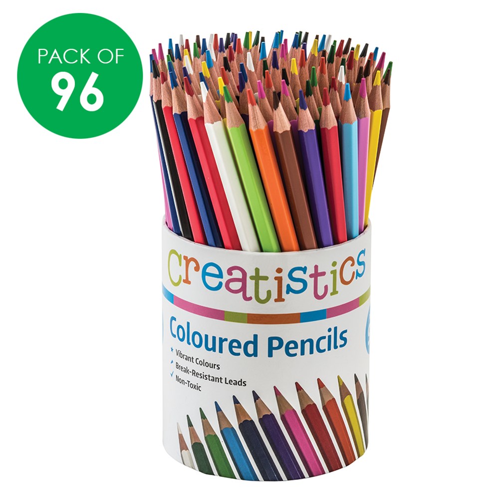 96 hexagonal, break-resistant pencils in 12 assorted colours. Handy storage tub included.
