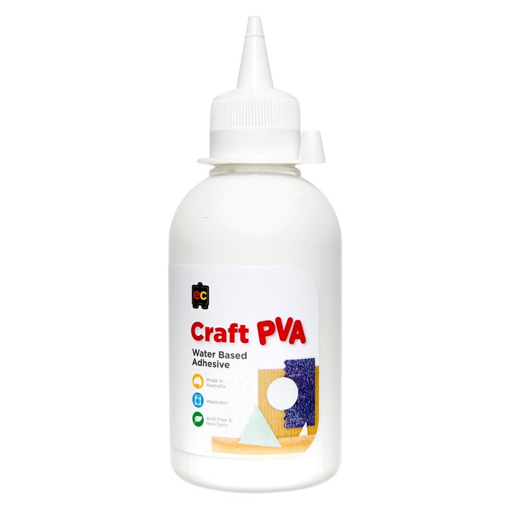 EC craft PVA glue is designed to bond paper, cardboard, wool and textiles. Comes in handy 250ml squeeze bottle for easier application. Australian made. Non-toxic. Washable. Acid free.