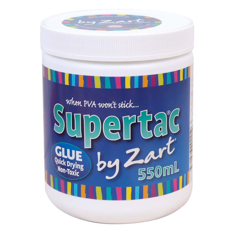 Supertac is ideal for strong, quick adhesion for a wide variety of materials including paper, card, fabric, foam, plastic, wood and more! Dries clear. Non-toxic.