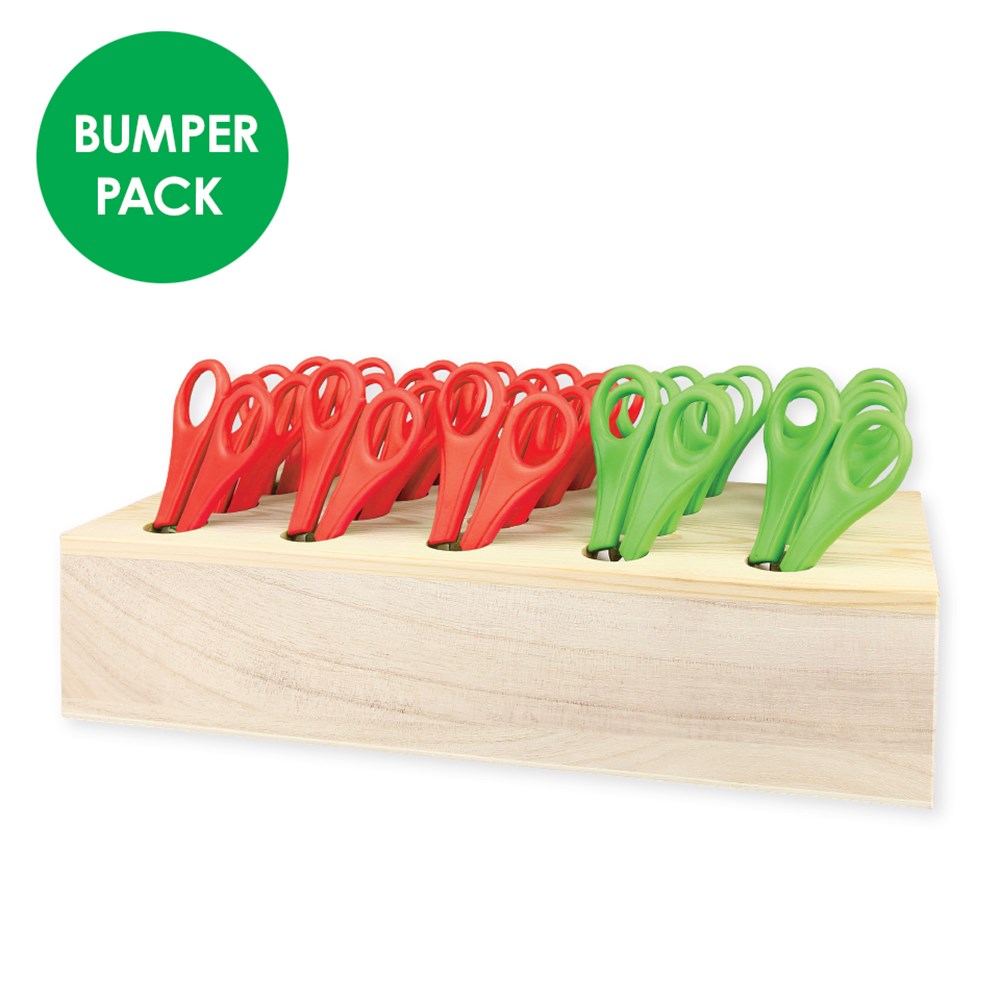 Scissor box measures 30 x 13 x 6.5cm with space for 20 scissors. Ruler scissors measure 12.5cm long. Contents may vary.