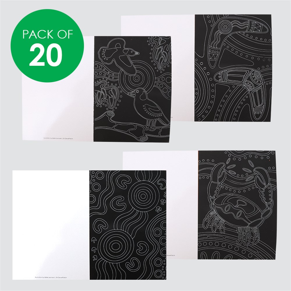 Each card has a pre-printed grey outline on top of a scratch board base. Scratch along, inside or outside the outline to reveal your design in Indigenous inspired colours! We recommend using scratch board tools (sold separately) to complete your designs.