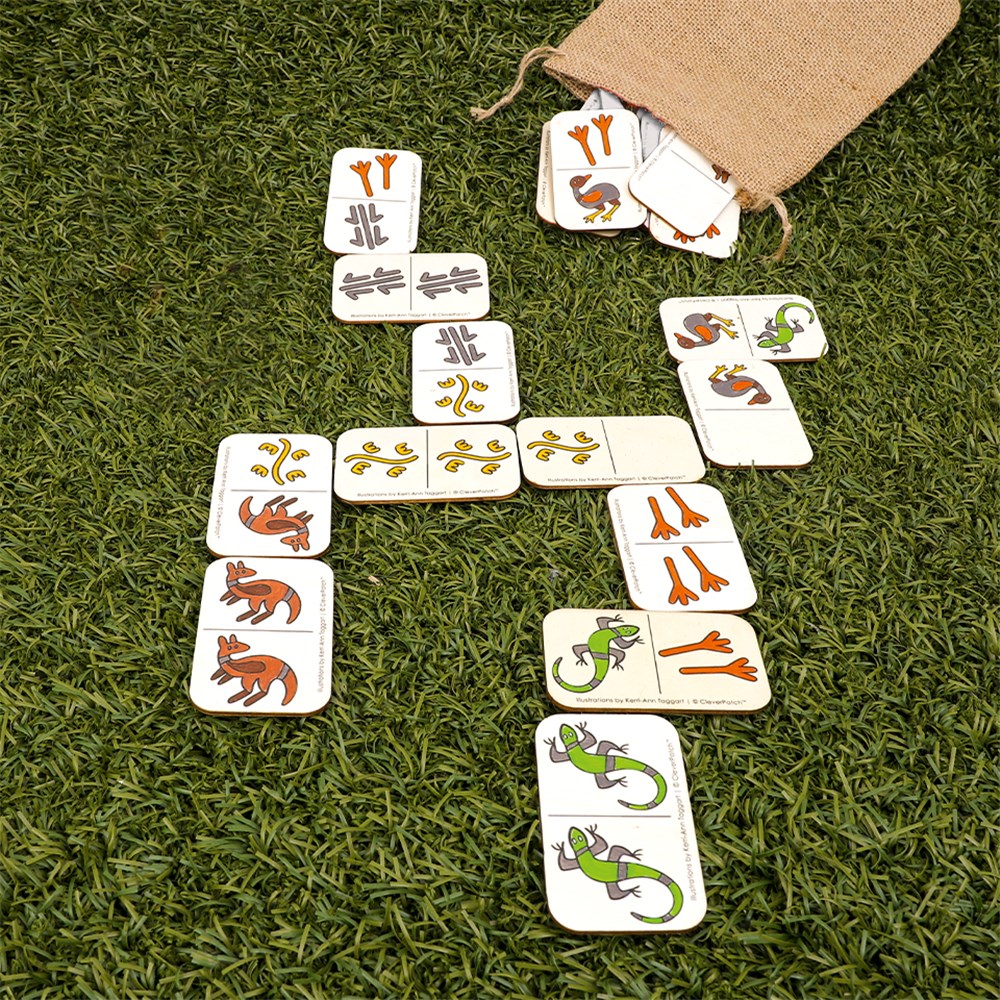 Designed by Indigenous Artist Kerri-Ann Taggart. Includes one full set of 28 pre-printed wooden dominoes packed into a cotton storage bag. Simply colour with markers, pencils or paint (sold separately). Each domino measures 5 x 8cm. 2mm plywood.