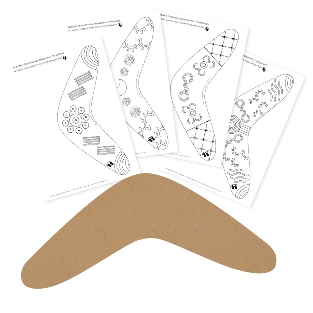 These boomerang shapes are made from 3mm wood and measure 28 x 12cm. Each kit includes components to complete 20 wooden boomerangs with A4 templates plus a bio from Michelle and information about the meaning of her artworks. 4 assorted designs per kit.