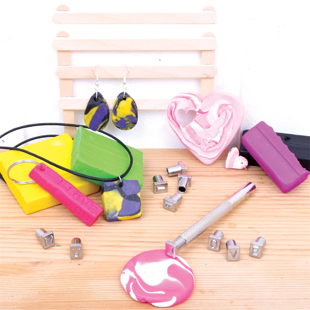 Set includes one handle and 36 interchangeable stampers (uppercase letters A-Z and numbers 0-9). Ideal for use with dough, clay and embossing foil. For best results on firmer surfaces, tap lightly on the end of the handle with a hammer.