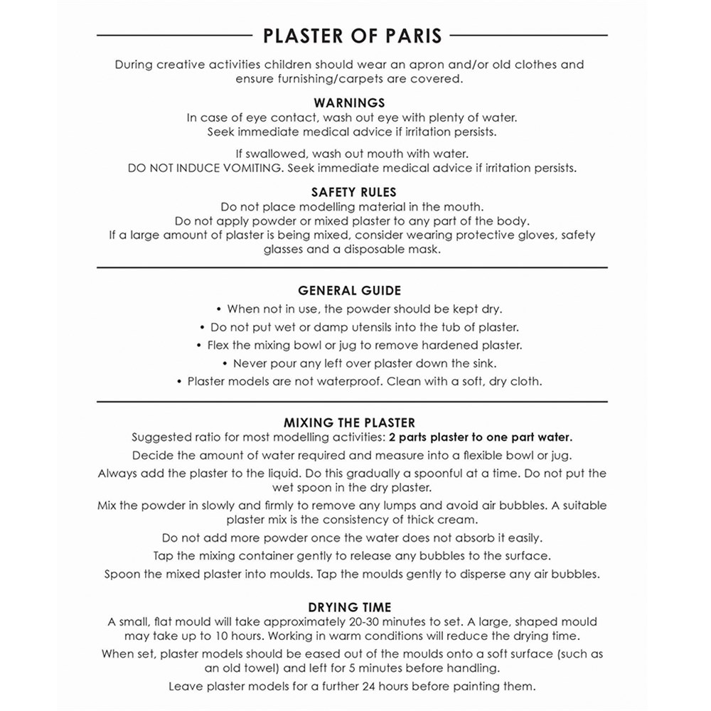 Simply add water and mix to create plaster. Suggested ratio is 2 parts plaster to 1 part water. Pour slowly into moulds, wait to dry and then decorate! Storage bucket and instructions included. Non-toxic. Adult supervision is recommended.