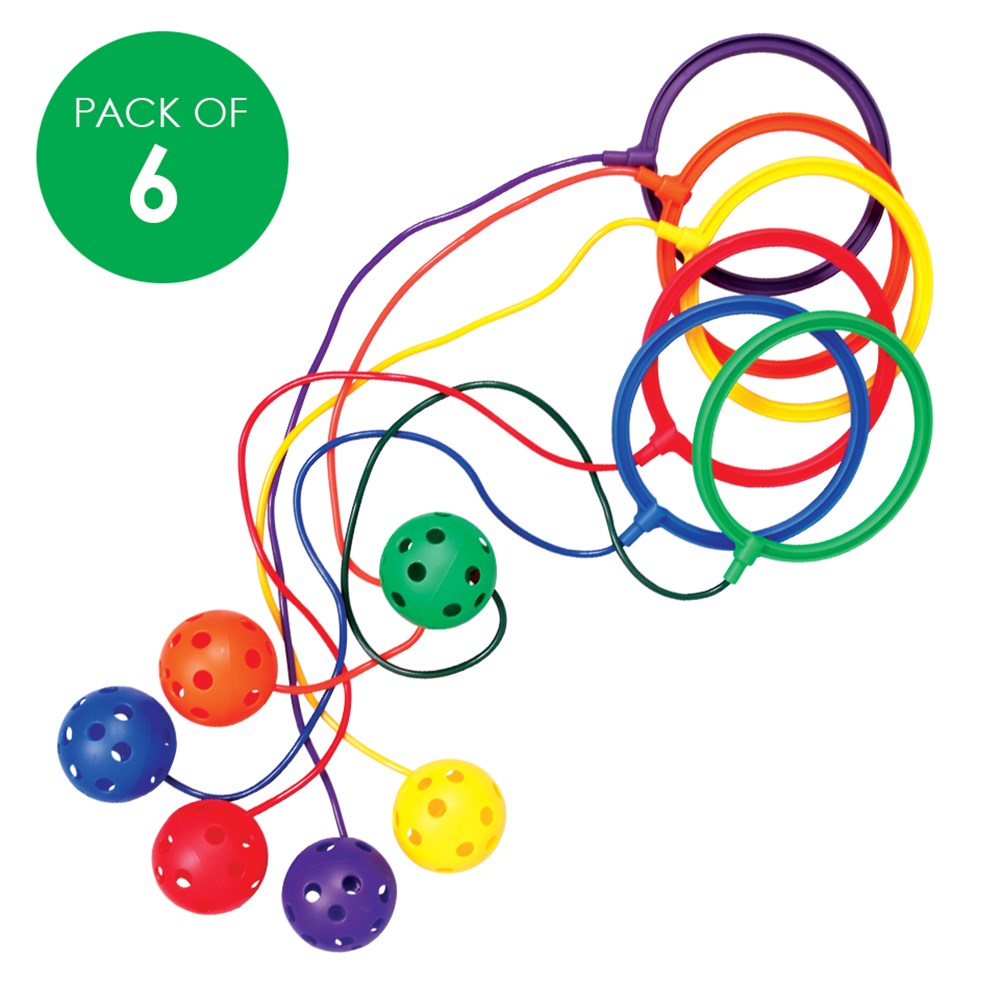 Pack of 6 in assorted colours. Each skip-o-hop consists of a plastic ankle hoop and a ball attached to the hoop via a PVC cord.