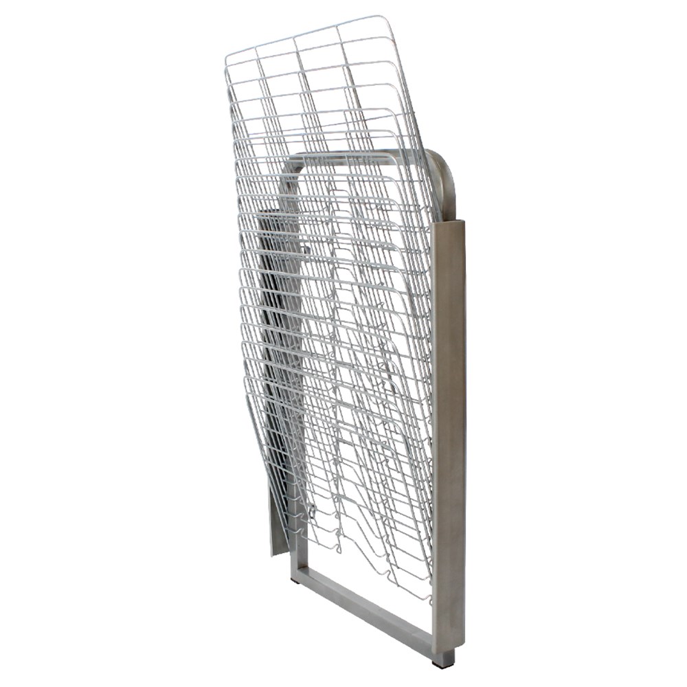 Wall mountable drying rack featuring 20 spring loaded shelves.