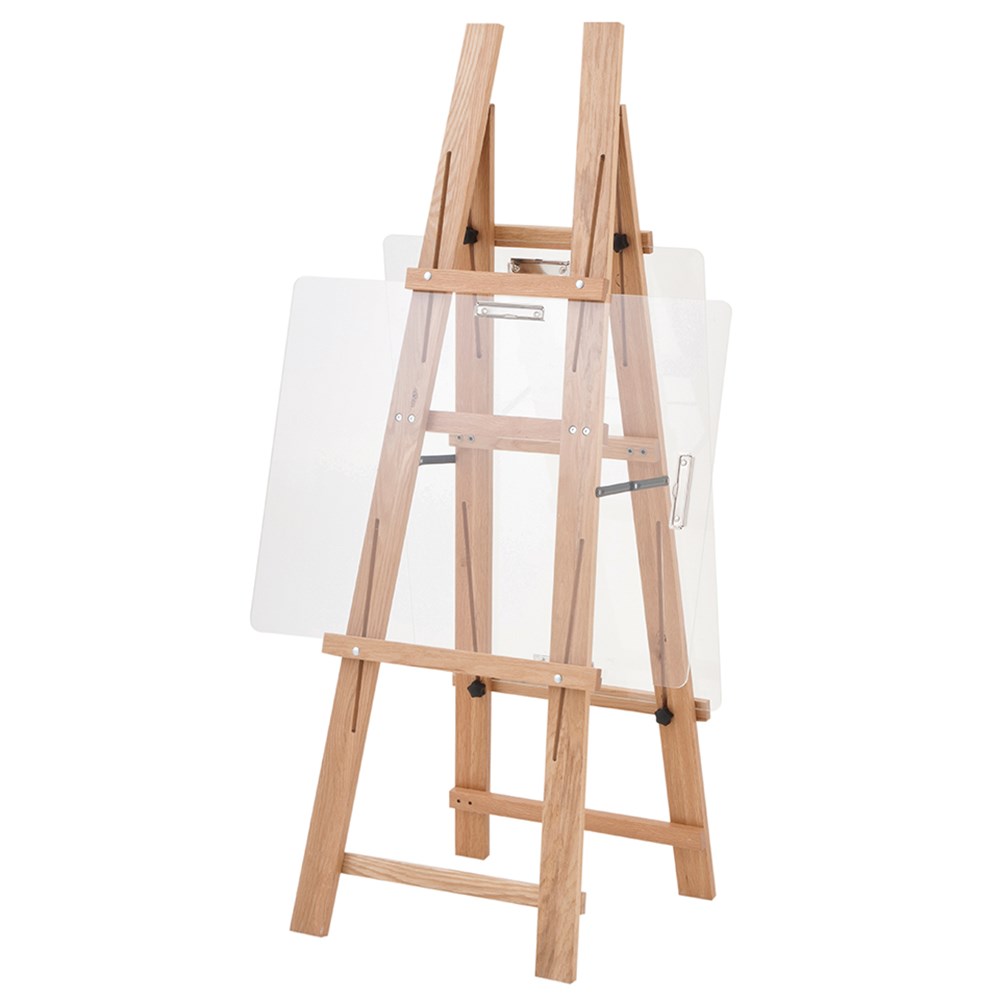 Junior Eiffel Art Easel supplied flat-packed for easy self-assembly. Easel is made from hardwood and includes two extra large 60 x 80cm clear Perspex boards with 2 clips to fit all sizes of easel paper. Easel measures 146.9 x 79.1 x 51.8cm when assembled.