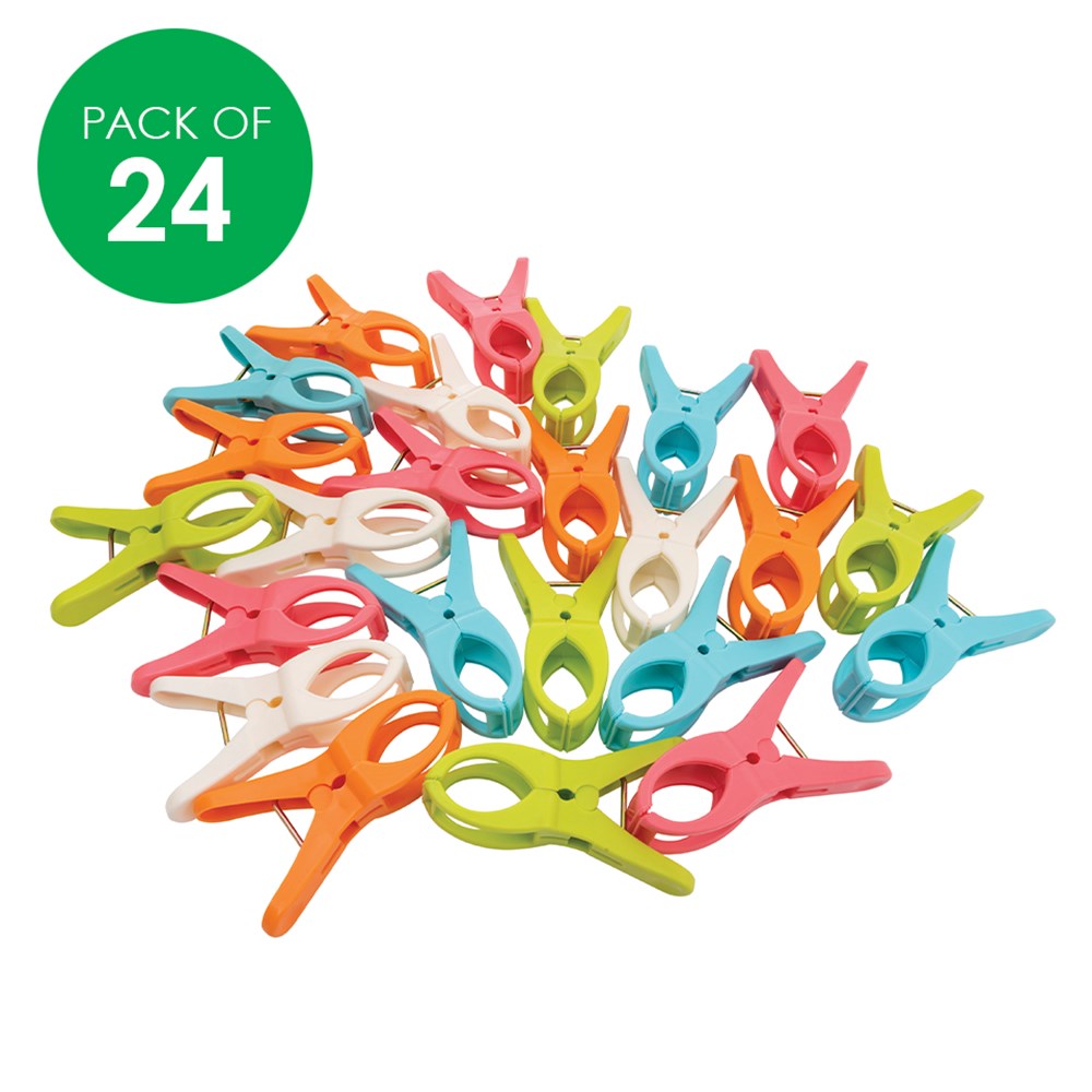 For both indoor and outdoor use, these Jumbo Plastic Pegs are durable and made of strong plastic. Wide grip to secure bulky items such as securing paper to easels and attaching splash mats to tables.