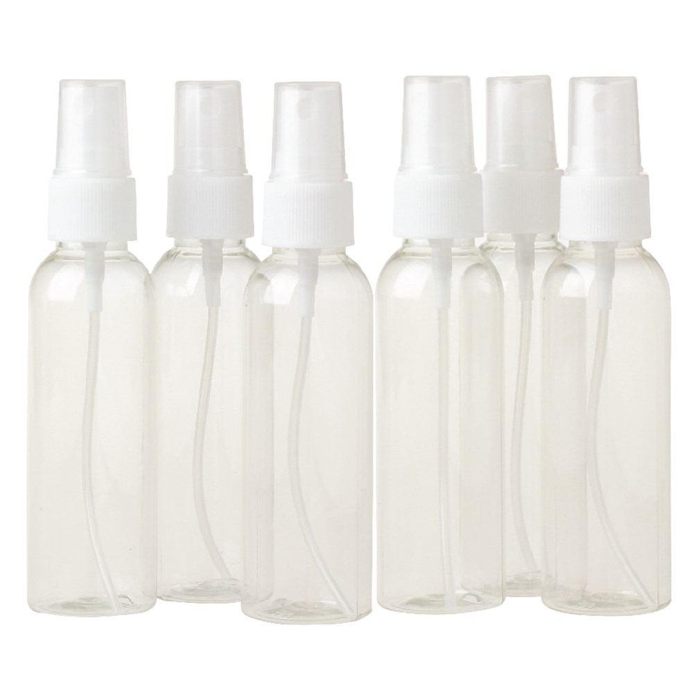 Clear spray mist bottles with caps. Each spray bottle measures 13 x 3cm and holds up to 60ml.