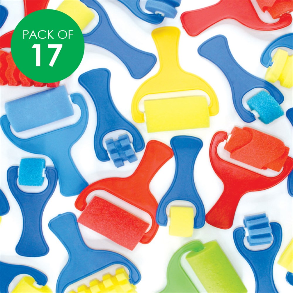 An assortment of sponge rollers with varying patterns and unusual designs. Largest sponge roller measures 13 x 10cm and smallest measures 13 x 5.5cm. Colours may vary.