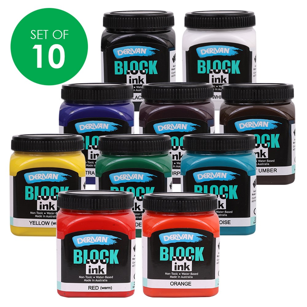 Block ink supplied in easy to use tubs. Set of 10 includes 1 of each colour (red, orange, yellow, green, turquoise, blue, purple, brown, black, white). Australian made. Water-based. Non-toxic. Washes up easily with water.
