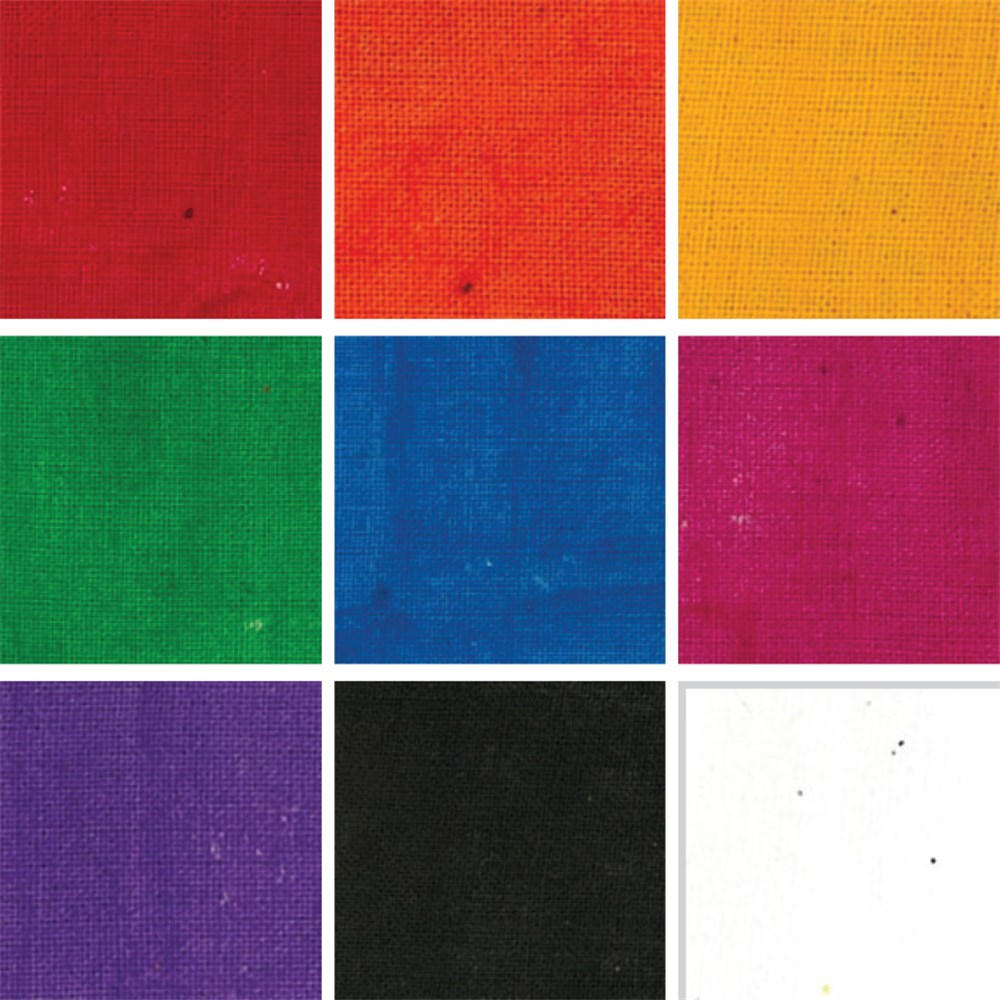 Set of 9 includes 500g of each colour (mid red, orange, golden yellow, mid green, mid blue, rhodamine, purple, black and white).