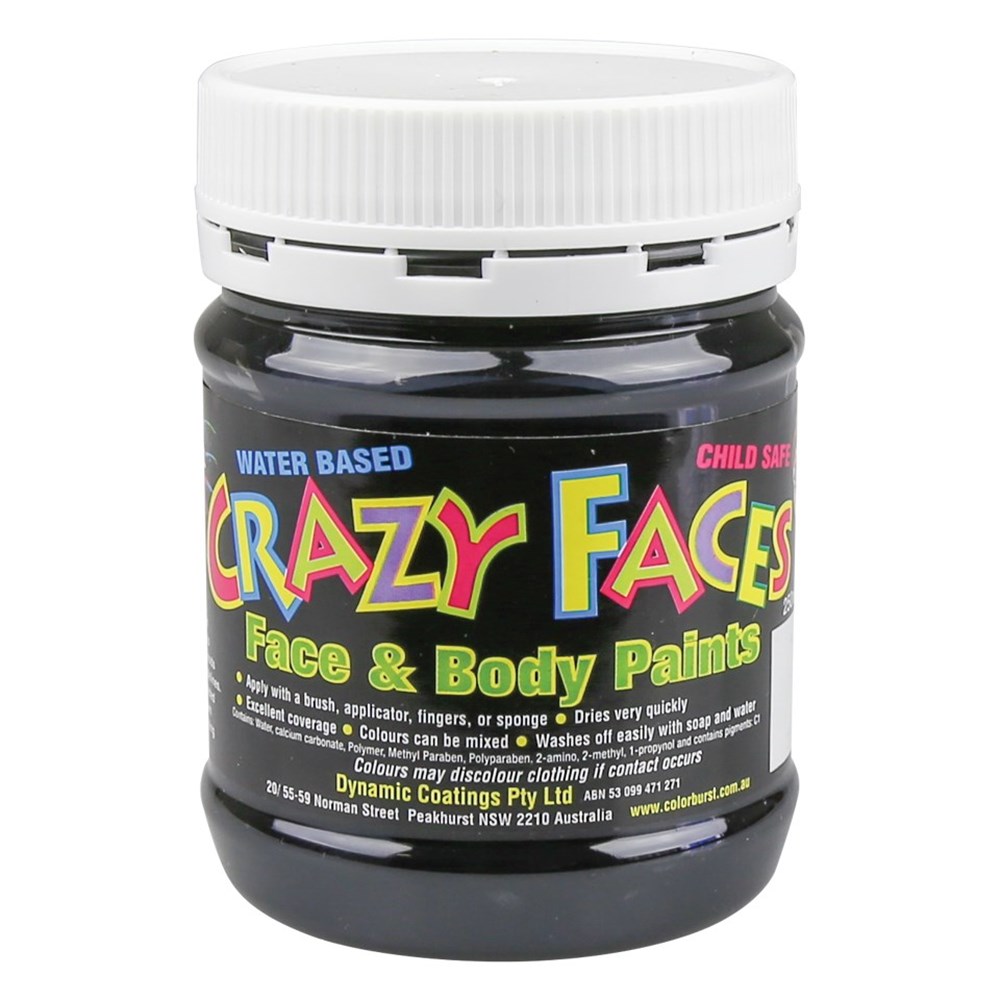 Crazy Faces is a water-based face and body paint. Thick and vibrant black colour. Dries easily with excellent coverage. Different colours can be mixed together. Washes off easily with warm water and soap. Non-toxic.