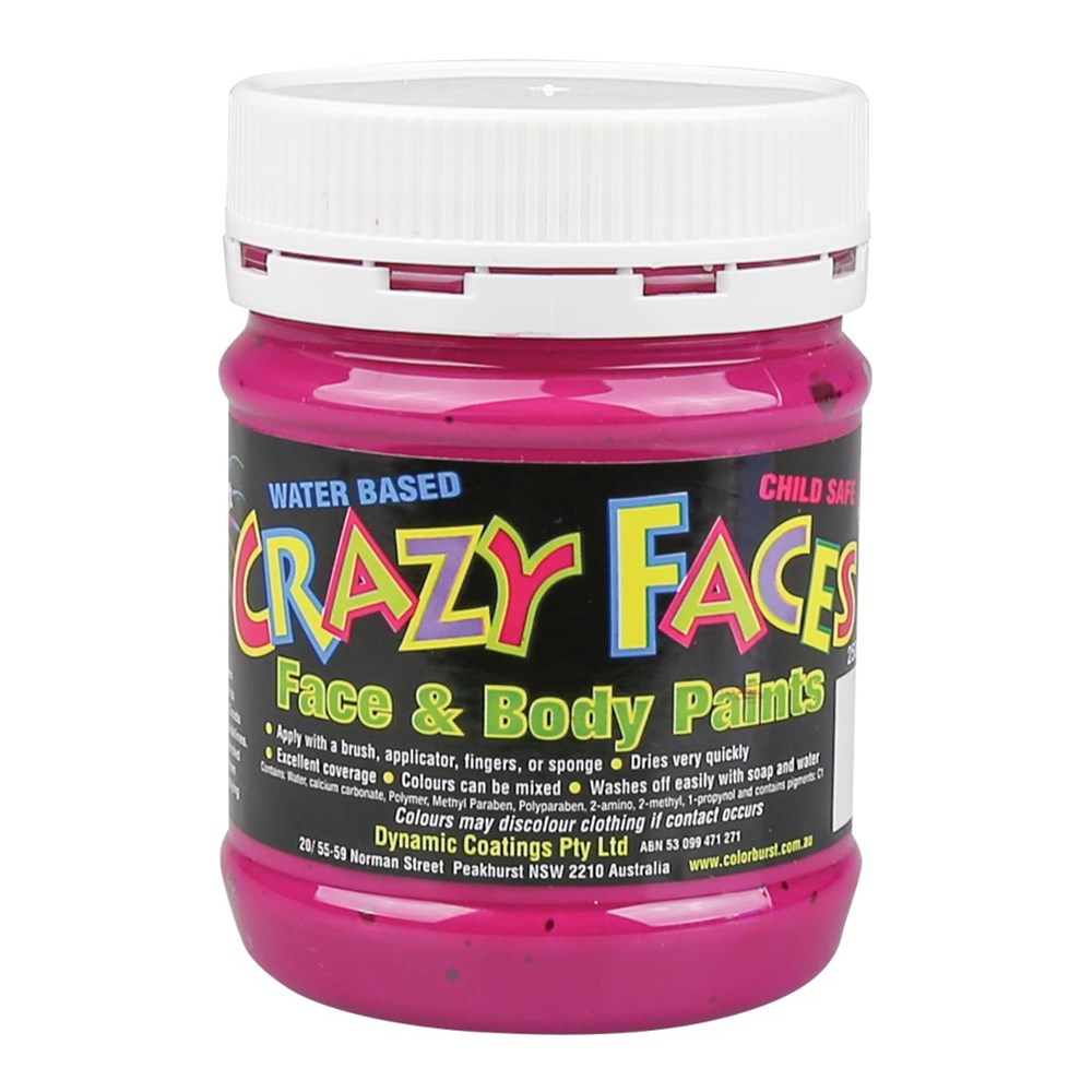 Crazy Faces is a water-based face and body paint. Thick and vibrant pink colour. Dries easily with excellent coverage. Colours can be mixed together. Washes off easily with warm water and soap. Non-toxic.