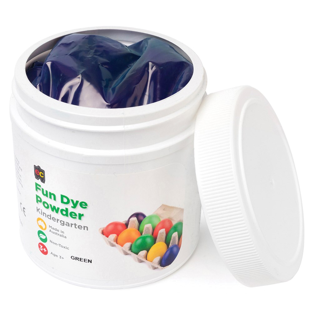 Green powdered fun dye suitable for use with paper, card, wood, wool or for colouring starch based finger paint. Simply add water or glue to vary the consistency.