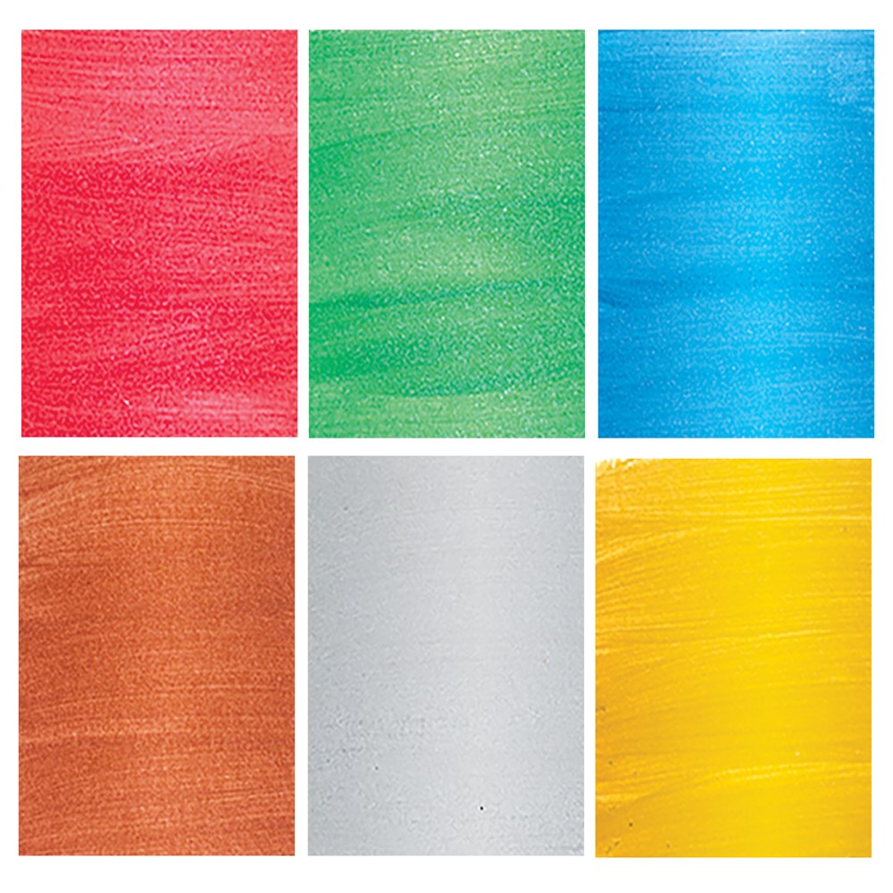 Australian made, water-based Metallic Paint for general purpose use. Non-toxic and washable. Set of 6 includes 1 of each colour (red, green, blue, copper, silver and gold).