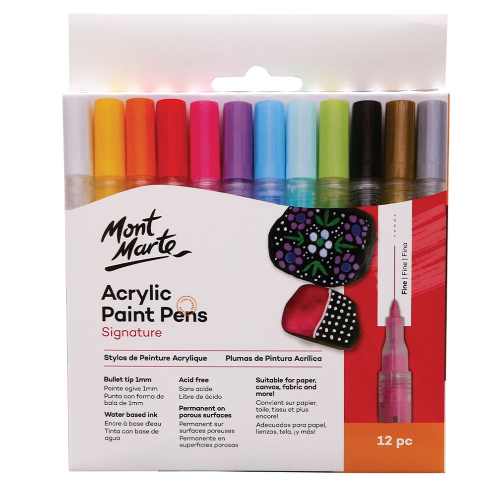 Fine tip measures 1mm. Each pack contains 12 assorted colours of waterproof and UV resistant (once dry) paint pens. Water-based, acid free and non-toxic formulation.