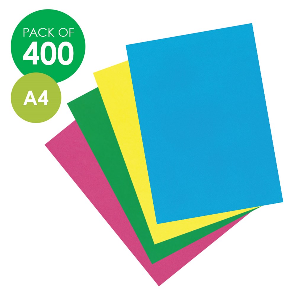 Double-sided A4 coloured cover paper provided in a set of 4 Easter Colours. 100 sheets per colour. 125gsm. Colours may vary.