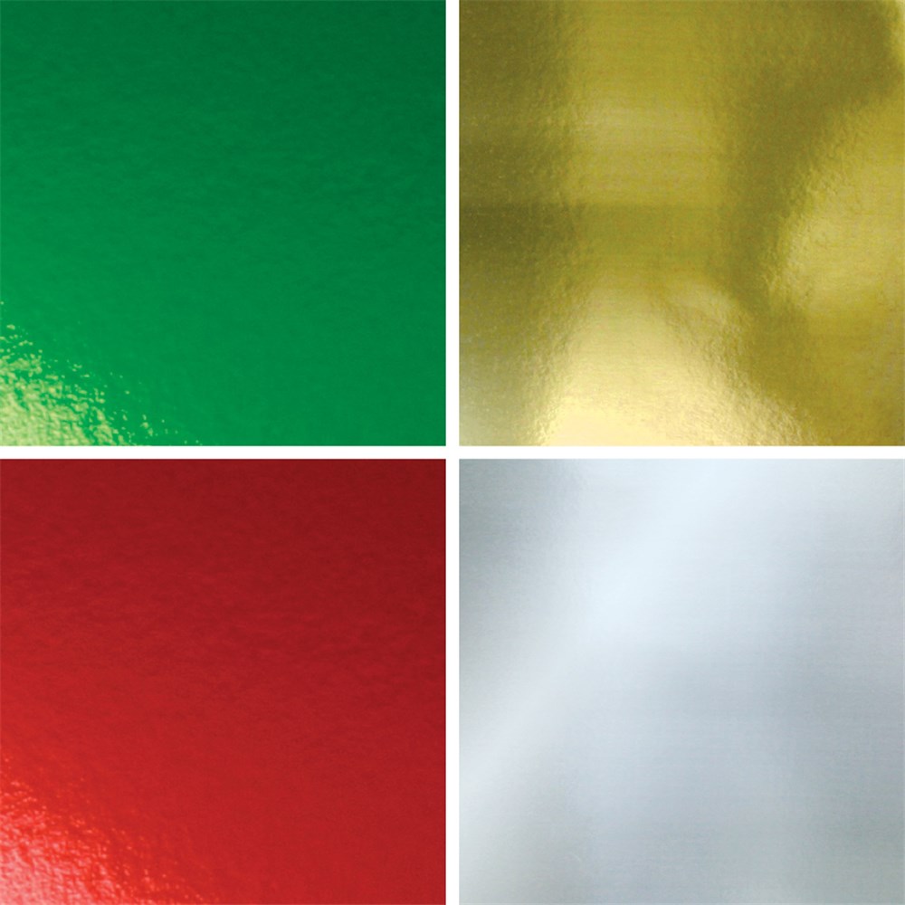 Single-sided glossy squares in 4 assorted Christmas colours. Gold and silver is 80gsm metallic foil paper. Red and green is 70gsm glossy paper. Each square measures 25.4 x 25.4cm.