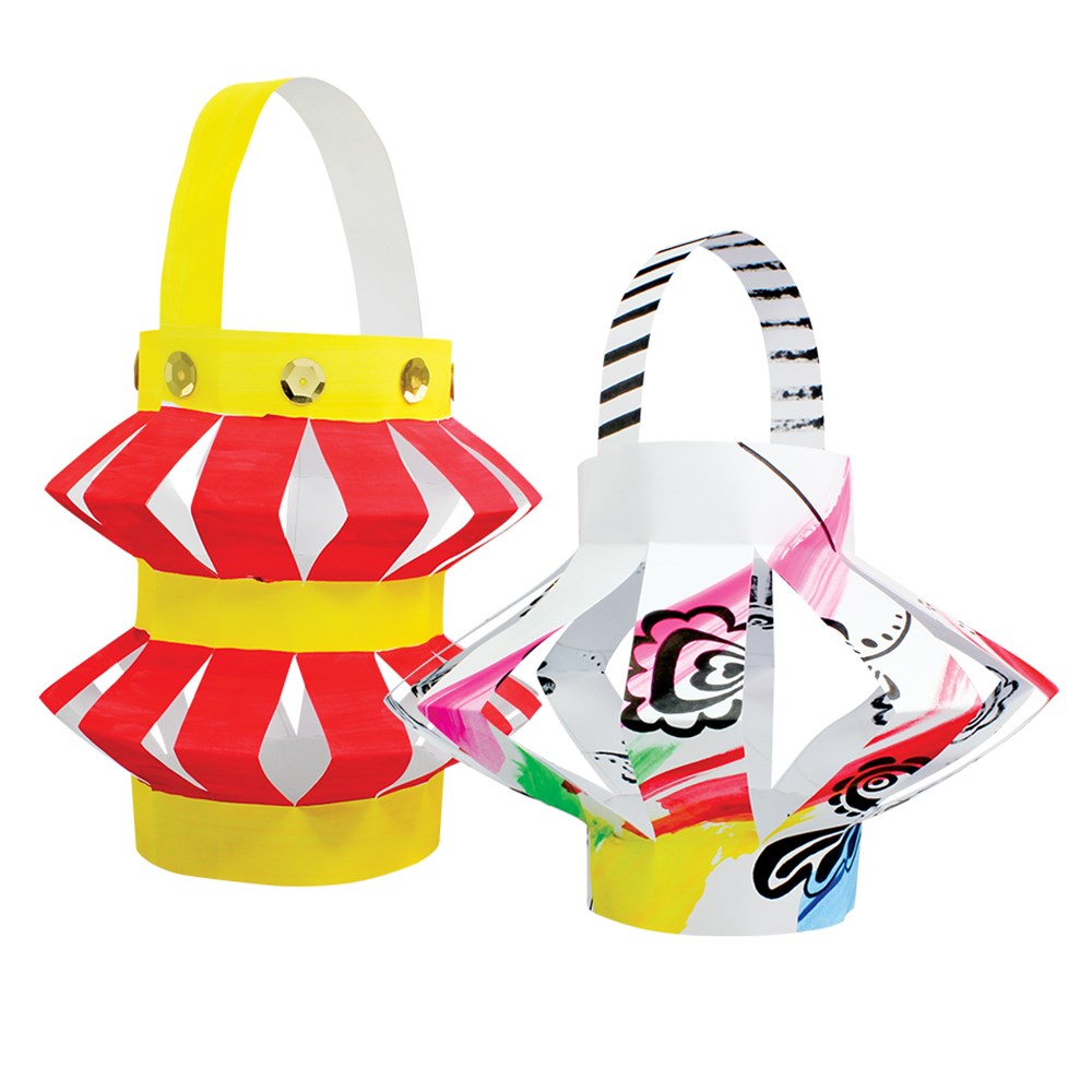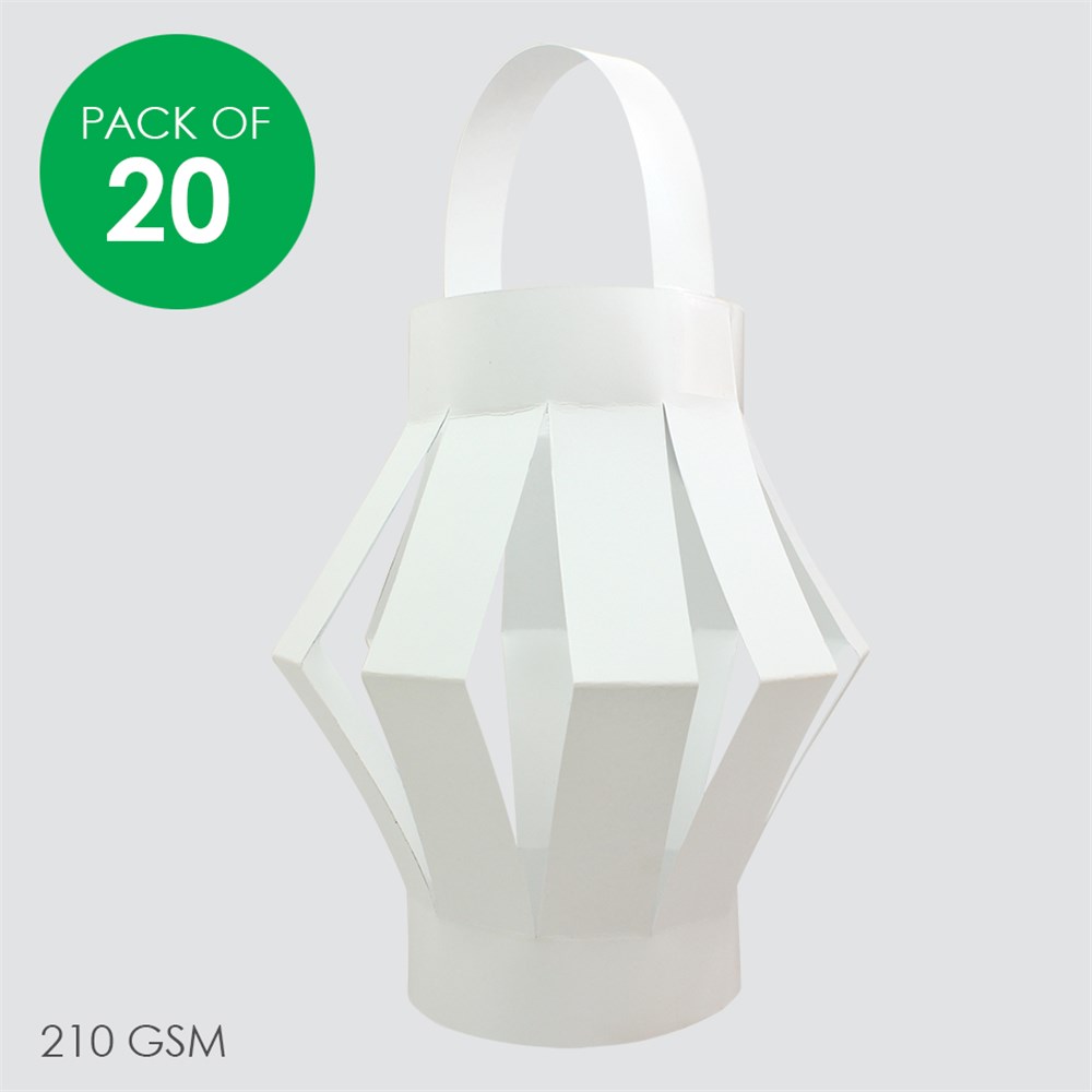 White cardboard Chinese lanterns in 2 assorted designs. Plain for you to create. Supplied flat-packed for easy self-assembly. Largest lantern measures 18 x 28cm when flat. 210gsm board.