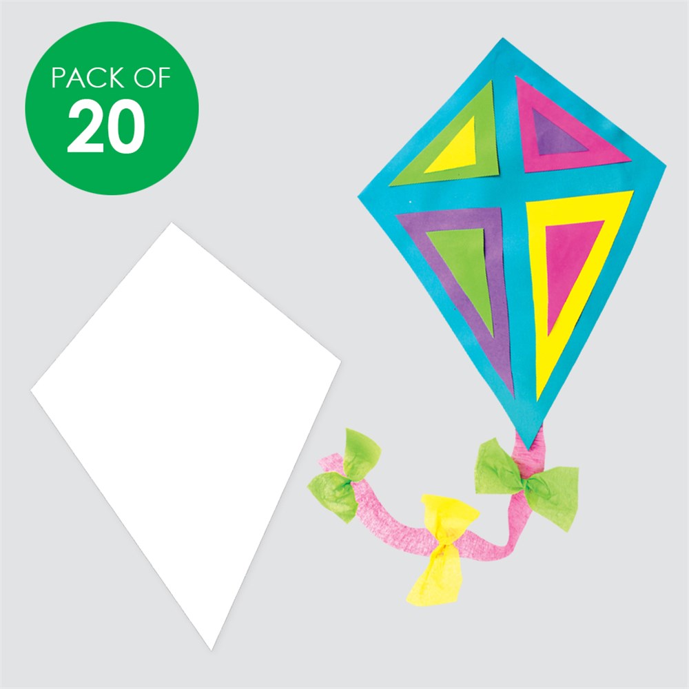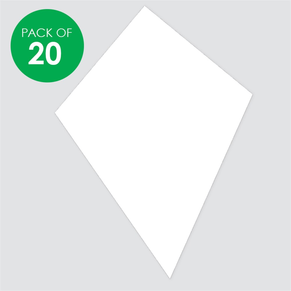 Australian made white cardboard kites. Plain for you to create. Each kite measures 20 x 28cm. 210gsm board. Ribbon not included.