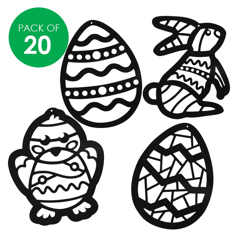 Pre-cut cardboard frames in 4 assorted designs. Black cardboard, plain for you to create. Each Sun Catcher includes a hole for hanging. Egg design measures 14.5 x 19cm. 300gsm board.