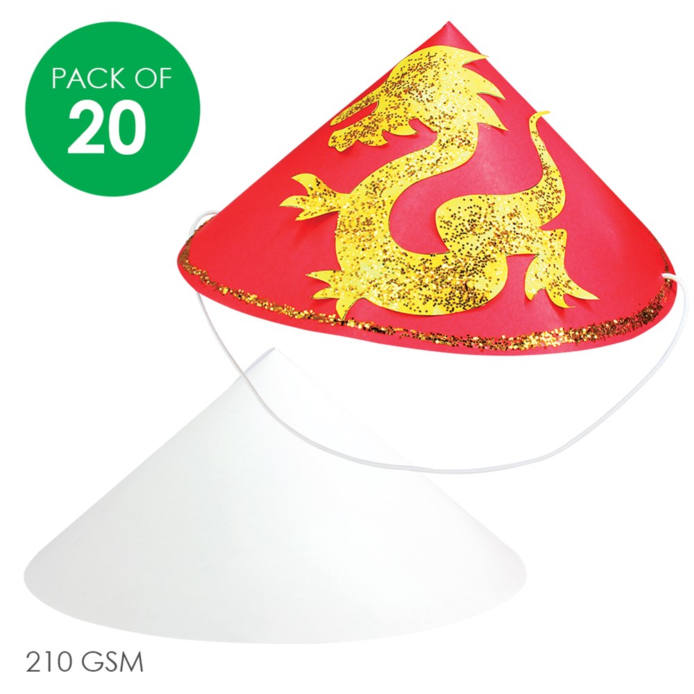 White cardboard oriental Asian hats come white for you to create. Australian made. Supplied flat-packed for easy self assembly. Elastic not included. Each oriental hat measures 12 x 22cm. 210gsm board.