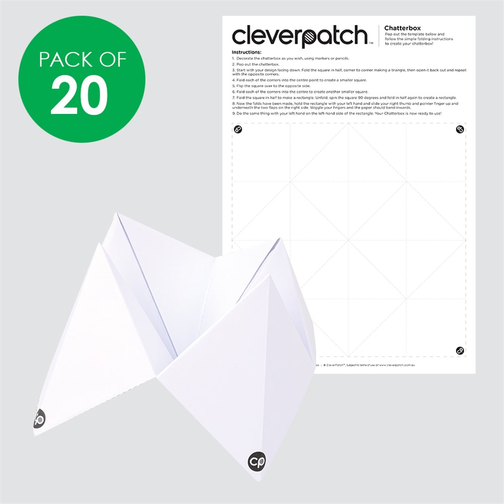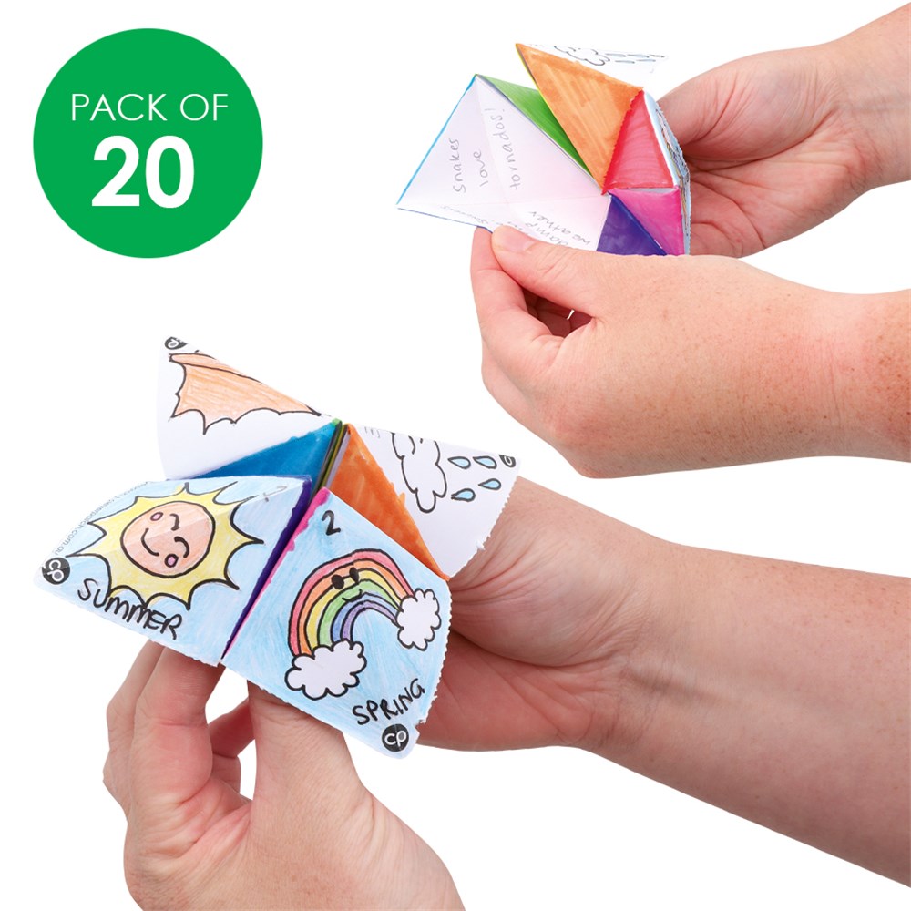 Simply pop-out, decorate and follow the included instructions to complete your Chatterbox! Each pack includes 20 flat-packed Chatterboxes with pre-scored fold lines. Plain for you to create your own design. Chatterbox measures 9 x 9 x 6.5cm when assembled. 125gsm paper.