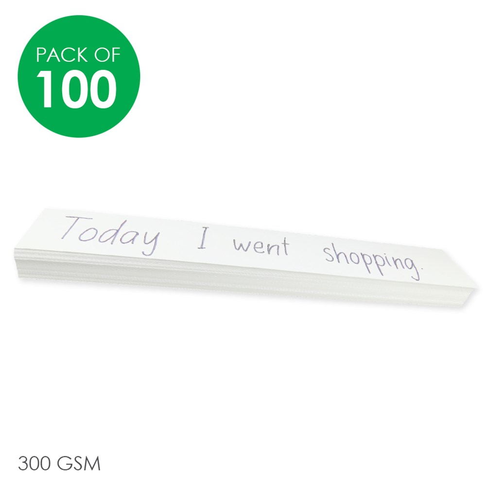 Pack of 100 white sentence strips that are plain for you to create. Double-sided white card with gloss effect on one side and matt on the other.