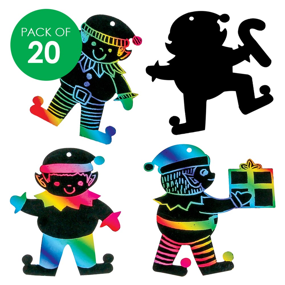 Scratch directly onto the black surface and your drawings will appear in multicolour! So easy and lots of fun. Experiment with different designs and patterns. Scratch board elves in 4 assorted designs. Includes a hole for hanging. Largest elf measures approximately 10 x 9.8cm. 250gsm board. Scratch board tools sold separately.