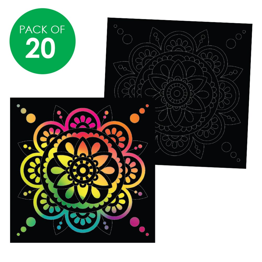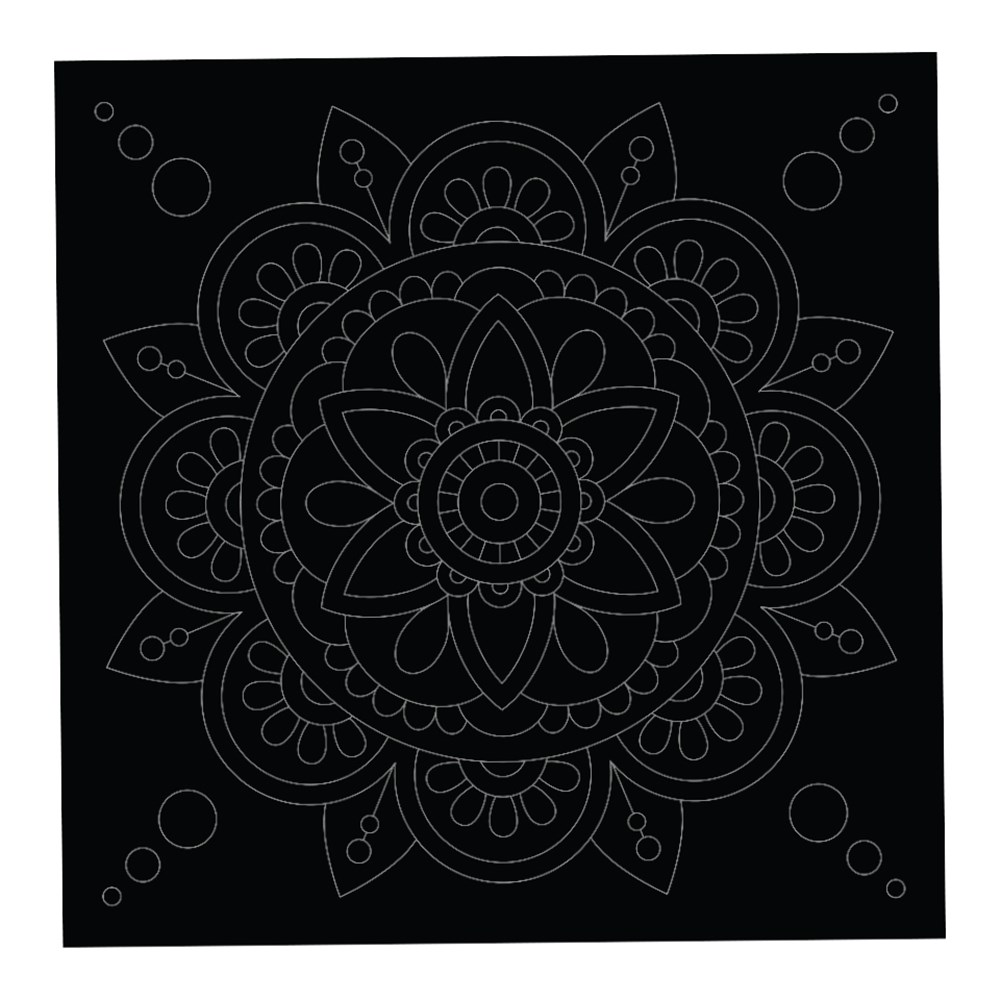 Each sheet has a pre-printed grey mandala outline. Scratch the black board surface inside, along or outside the lines to create your design in multicolour. Sheets measure 21 x 21cm. 250gsm board. Scratch Board Tools sold separately.