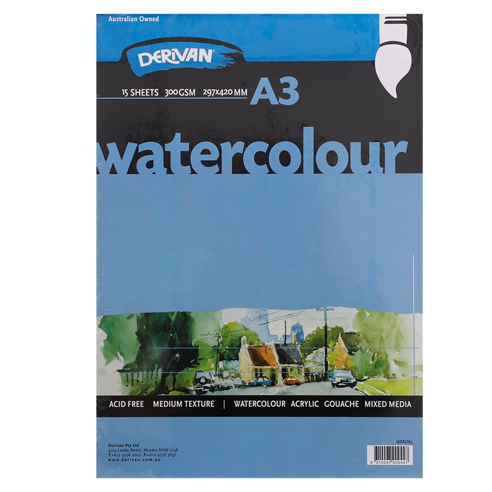 Medium textured watercolour paper pad. Includes 15 A3 size sheets. Acid free. 300gsm.