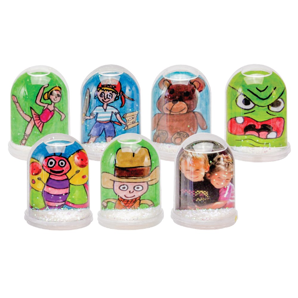 Create your own mini snow globe by inserting a design or photograph into this glittery snowstorm. Plastic. Supplied with 2 blank card inserts for you to create. Glitter and instructions included. Once complete, simply add water. Measures 5.5 x 7cm. Water not included.