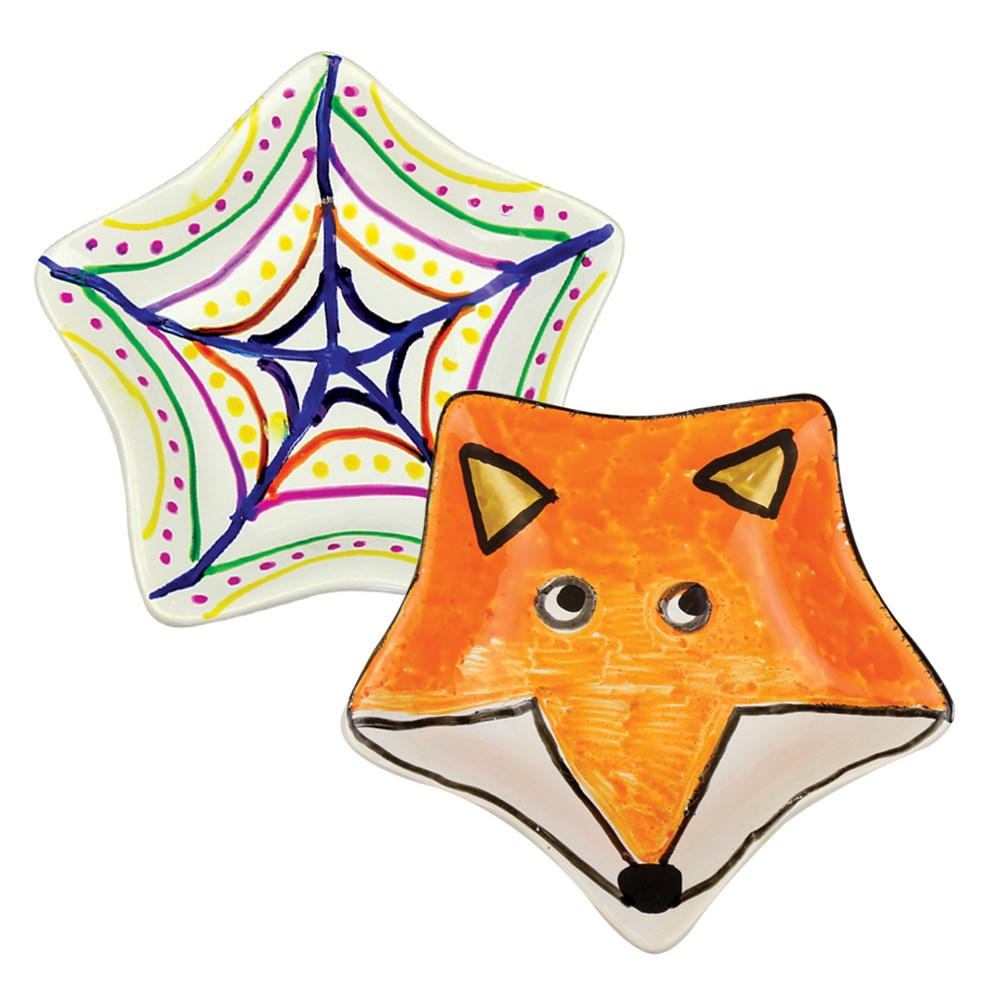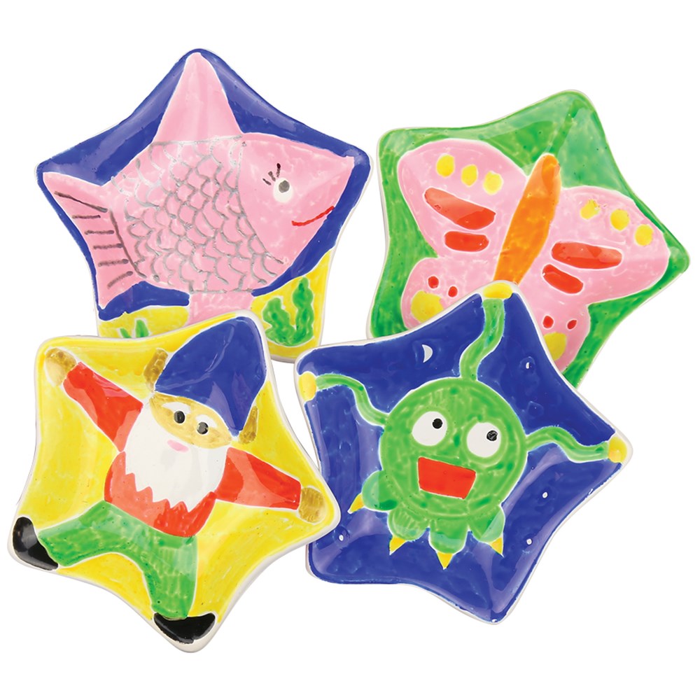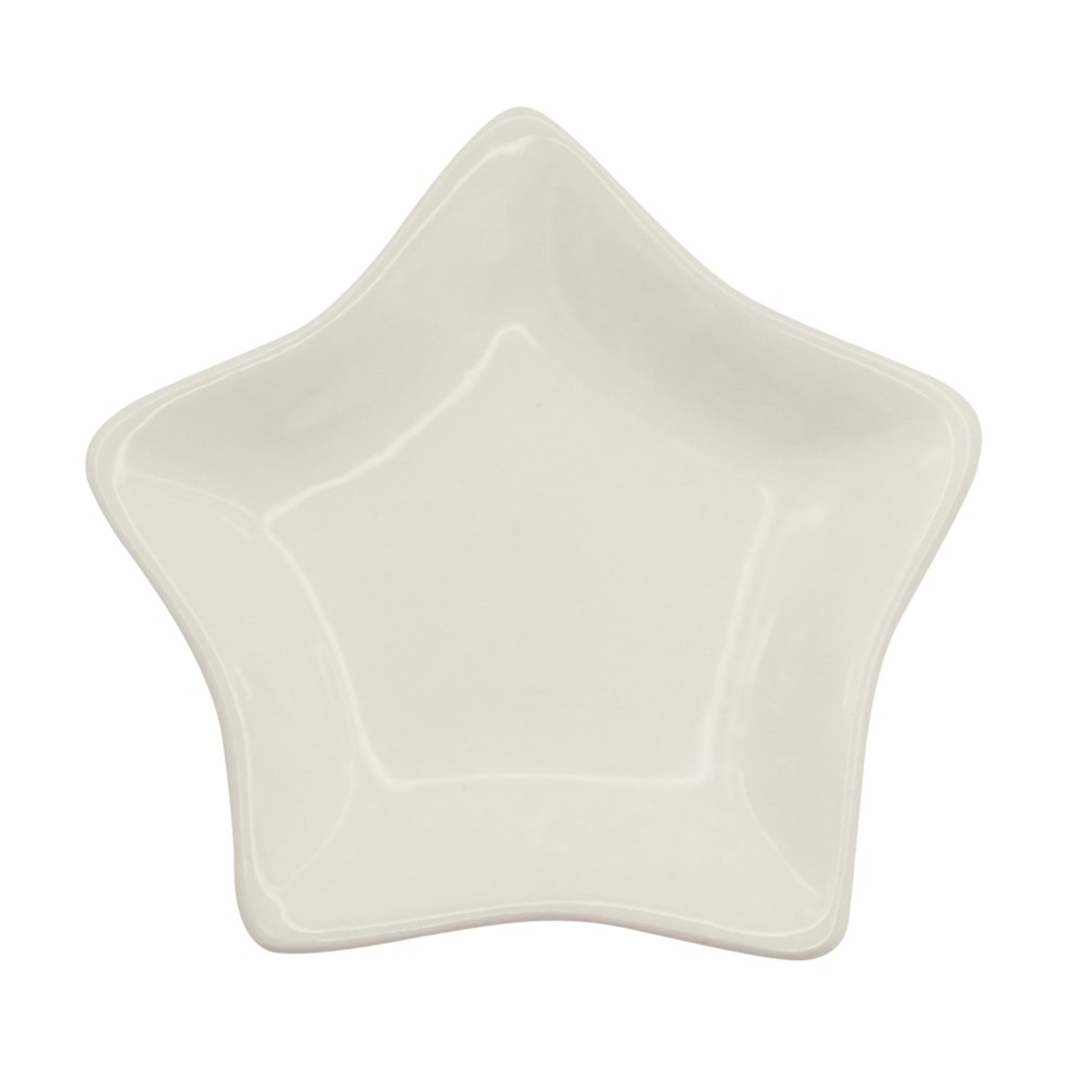 Glazed porcelain star dish. Plain for you to create. Decorate with our CleverPatch Glass & Porcelain Markers. Measures 8.5cm in diameter and 1.5cm deep. Supplied in an individual box, perfect for safe handling and gifting!