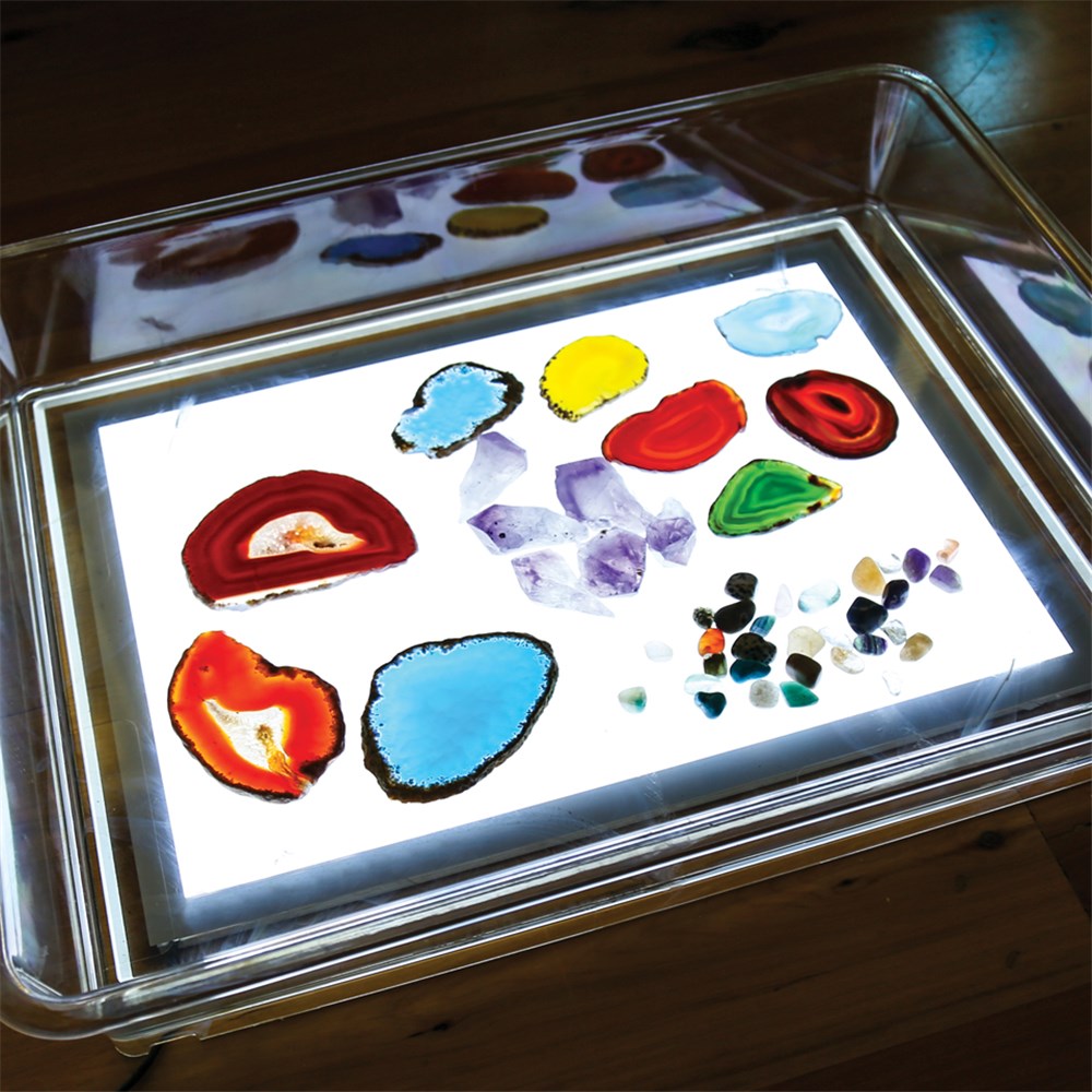 Our exploration light tray is made from heavy duty clear polycarbonate which gives it strength and durability. It is waterproof and can be filled with water, paint, dyes and much more. Designed for use with our Ultra Bright LED Light Panel. The internal tray size has been designed to accommodate A3 paper. Explore sensory development, marbling, finger painting and much more! You can even contain your messy projects in this extra handy tray! Tray measures 56.5 x 44 x 10cm.