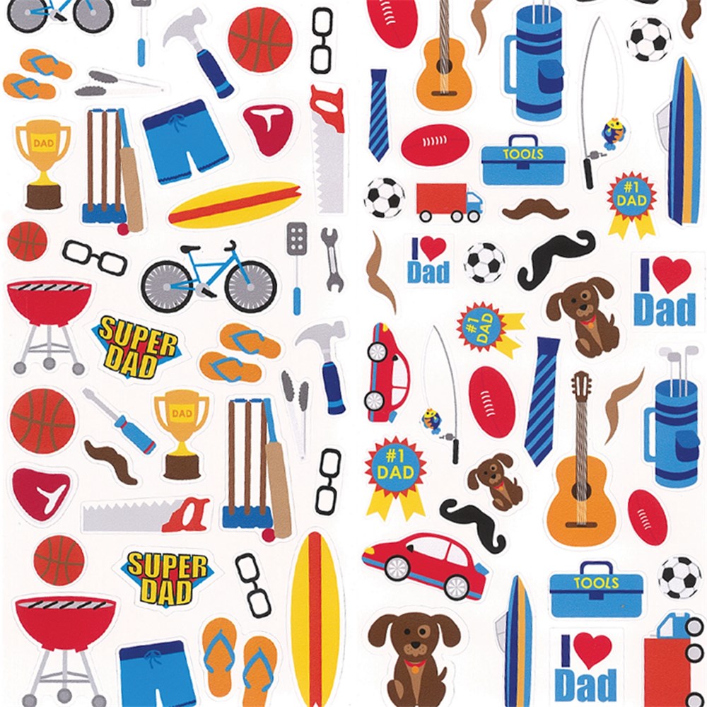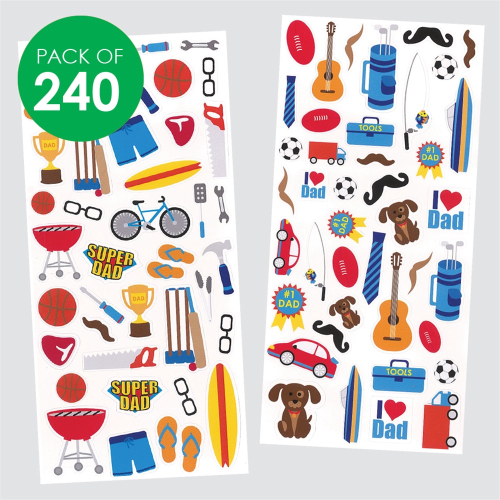 Stickers in assorted Father's Day designs. Includes 6 sheets of stickers. Largest sticker measures 5 x 2.1cm.