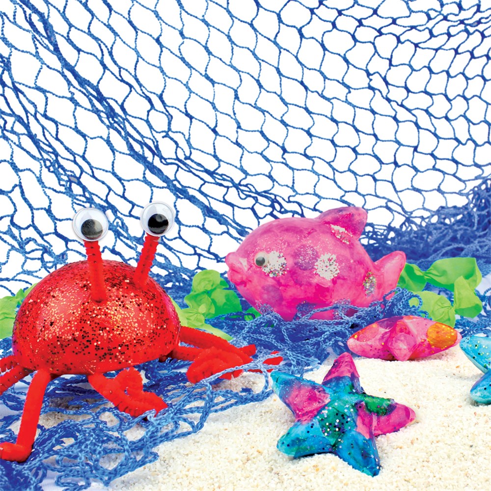 Blue fish net ideal for displaying collage and craft projects on walls or hanging from ceilings. Measures approximately 6 x 1.8m. Accessories not included.
