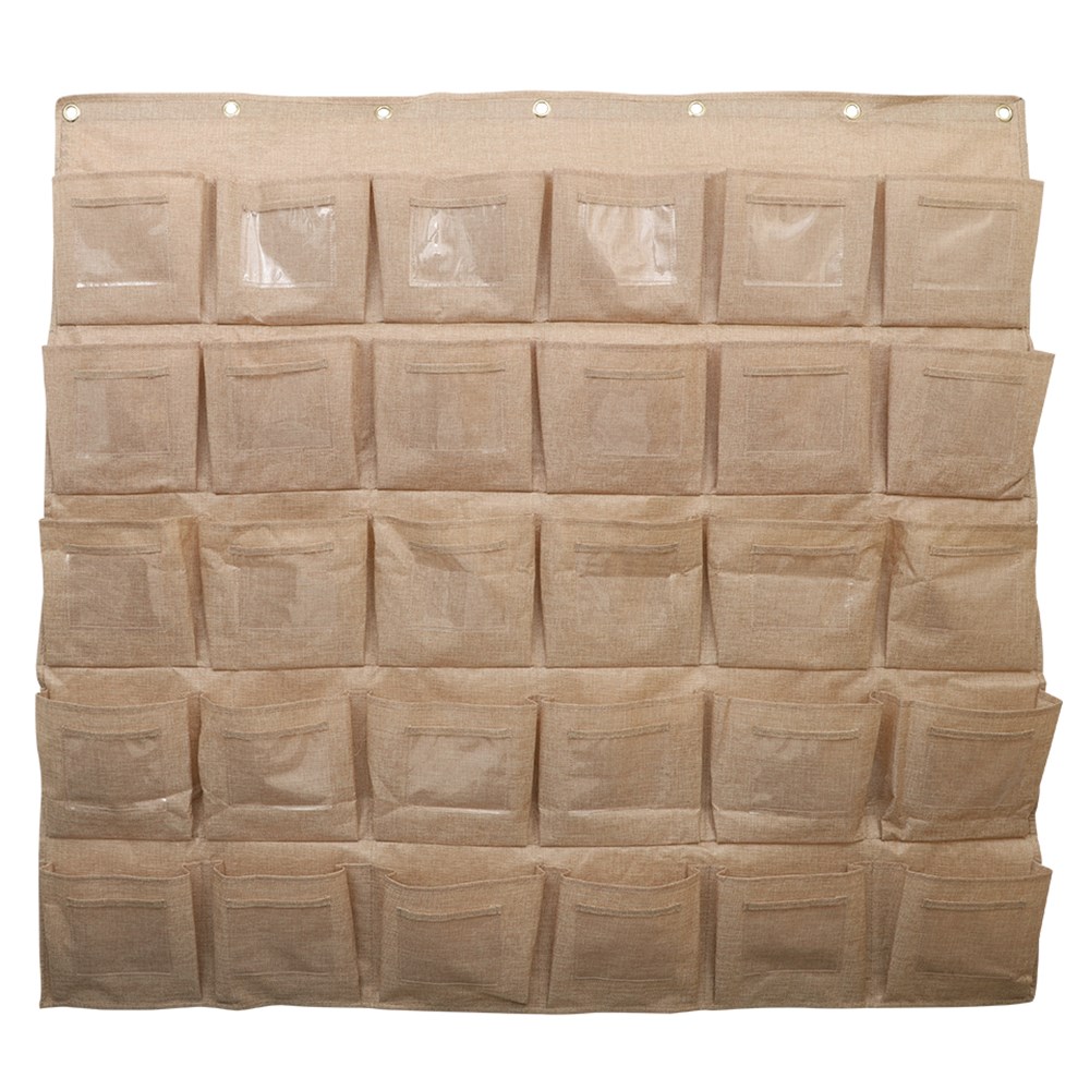 Measures 120 x 110cm and includes 7 eyelets for hanging. Each individual pocket measures 21 x 17cm and expands to approximately 29 x 17cm.